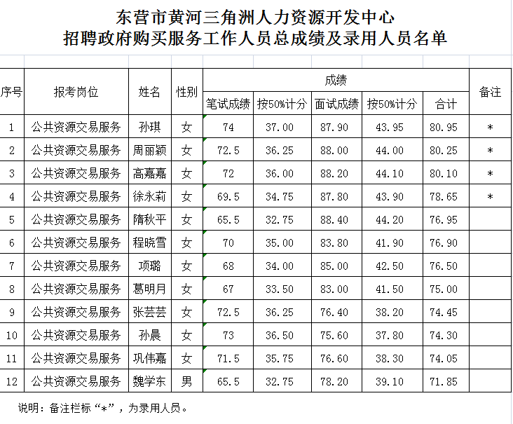 根據(jù)本次招聘活動的安排,現(xiàn)將進入面試人員的總成績及錄用人員名單予以公布。望被錄用人員按照統(tǒng)一規(guī)定和要求辦理相關(guān)錄用手續(xù)。